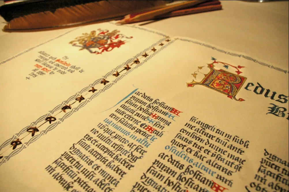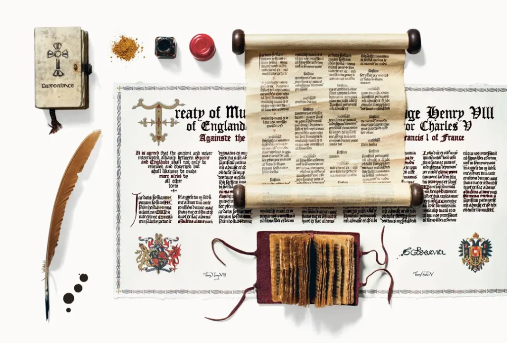 Manuscripts, stained glass windows, scrolls, and books from seasons three and four of The Tudors, by Annie Atkins.